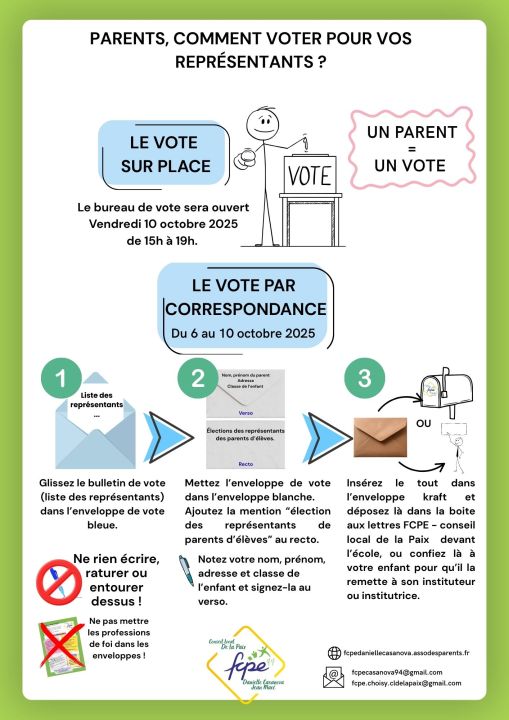 Les parents voteront à bulletin secret à l’école durant l’ouverture du bureau de vote le vendredi 10 octobre ou par correspondance.